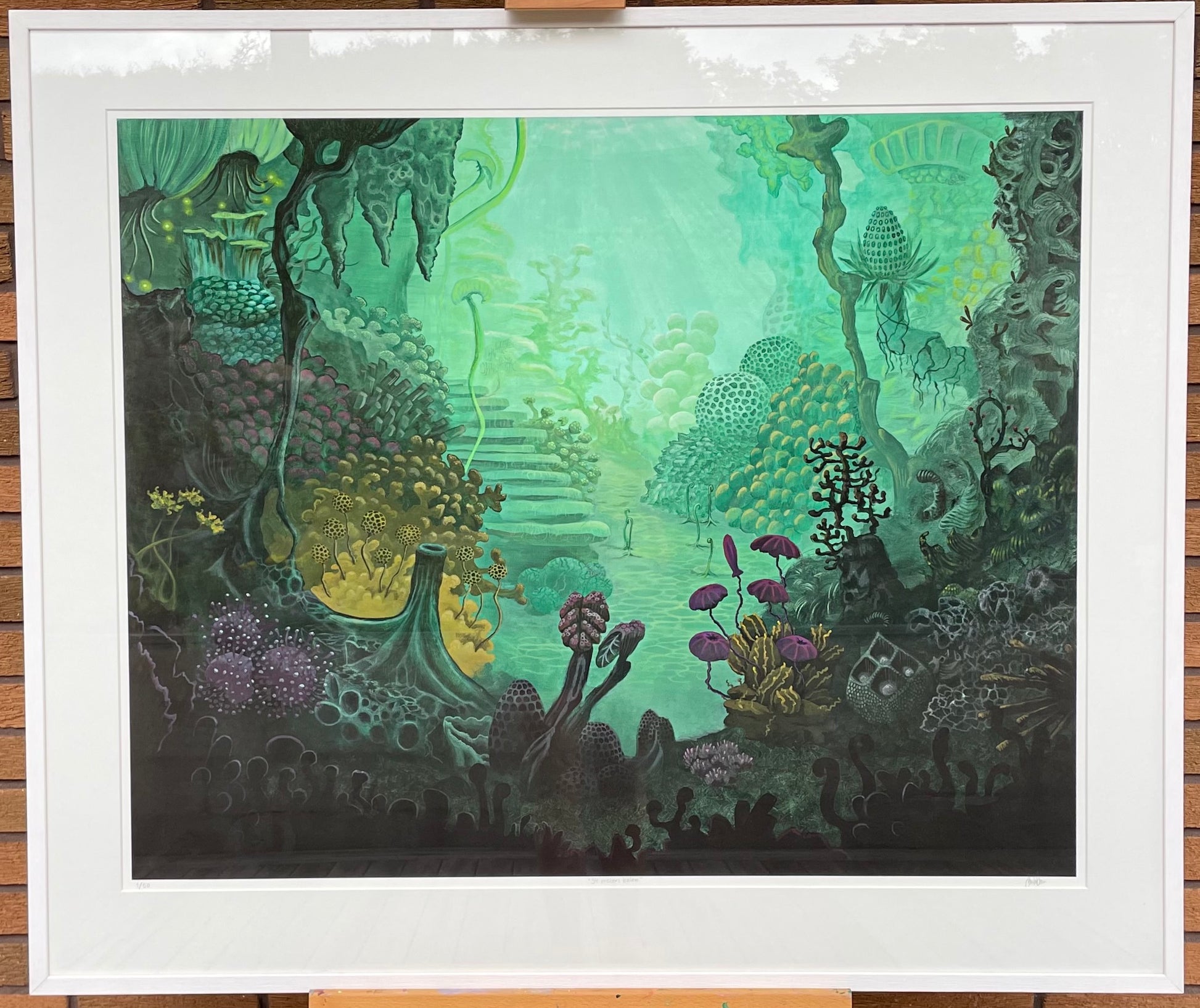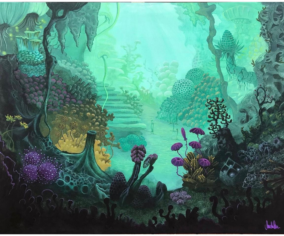Konsttrycket "34 meters below" är ett konsttryck från en tavla målad 2019. Motivet ska ge en inblick i en värld under ytan. Men det är en havsvärld med former och färger som inte är realistiska. Sandras konst är till för att väcka fantasin och få betraktaren att drömma sig bort, gärna med lite mystik inblandat. Sandra gillar färger och former i harmoni så förutom fantasilandskap skapar hon även abstrakta målningar med inslag av grafiska mönster.
